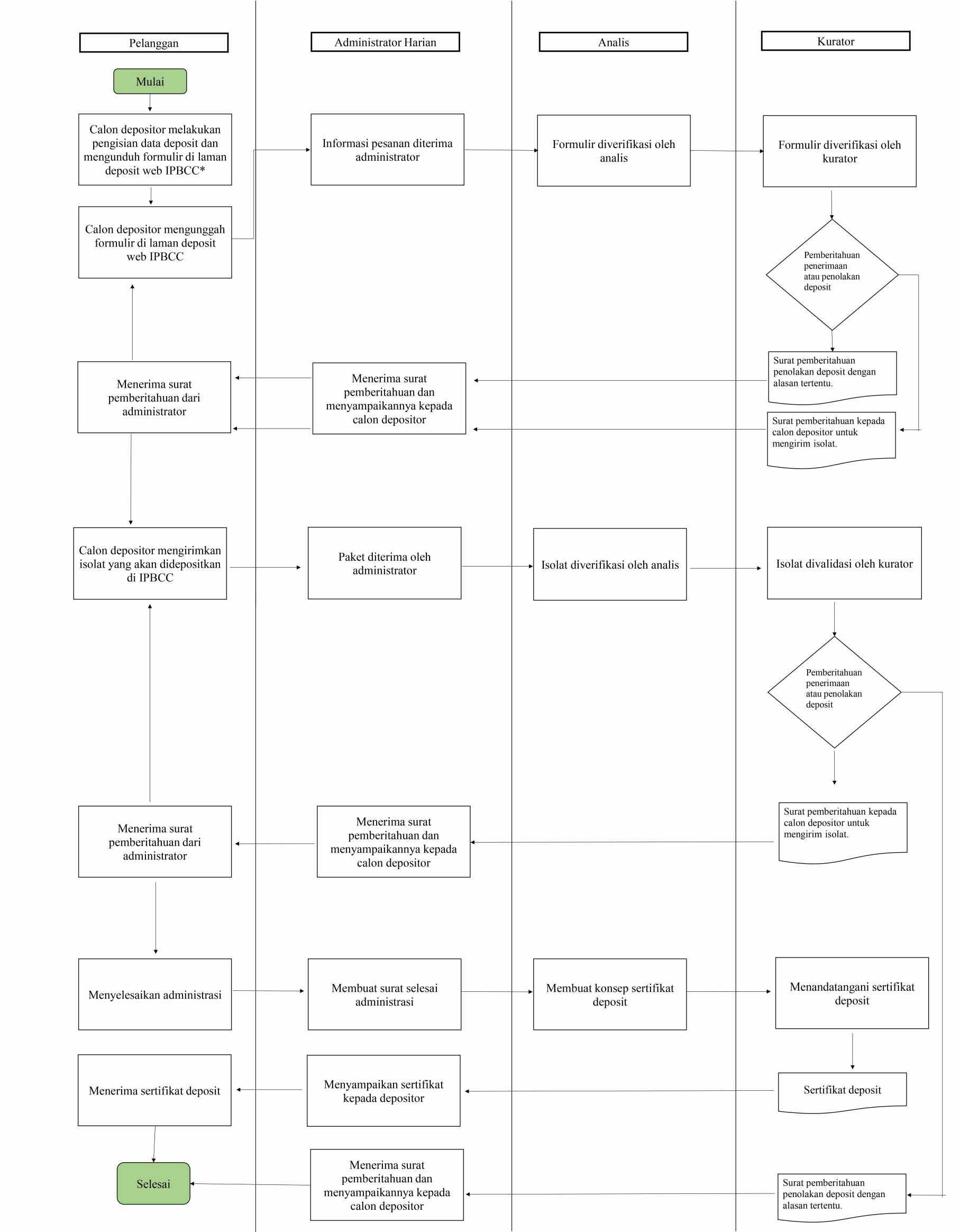 IPBCC menerima penitipan koleksi biakan dengan standar dan perjanjian yang ditentukan oleh IPBCC. Berikut merupakan langkah deposit biakan di IPBCC